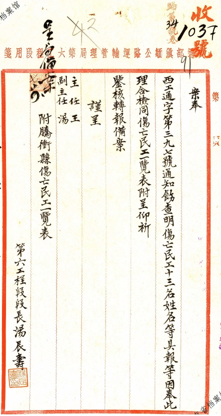 图为1939年7月17日,交通部滇缅公路运输管理局第六工程段关于送腾冲县伤亡民工一览表的呈