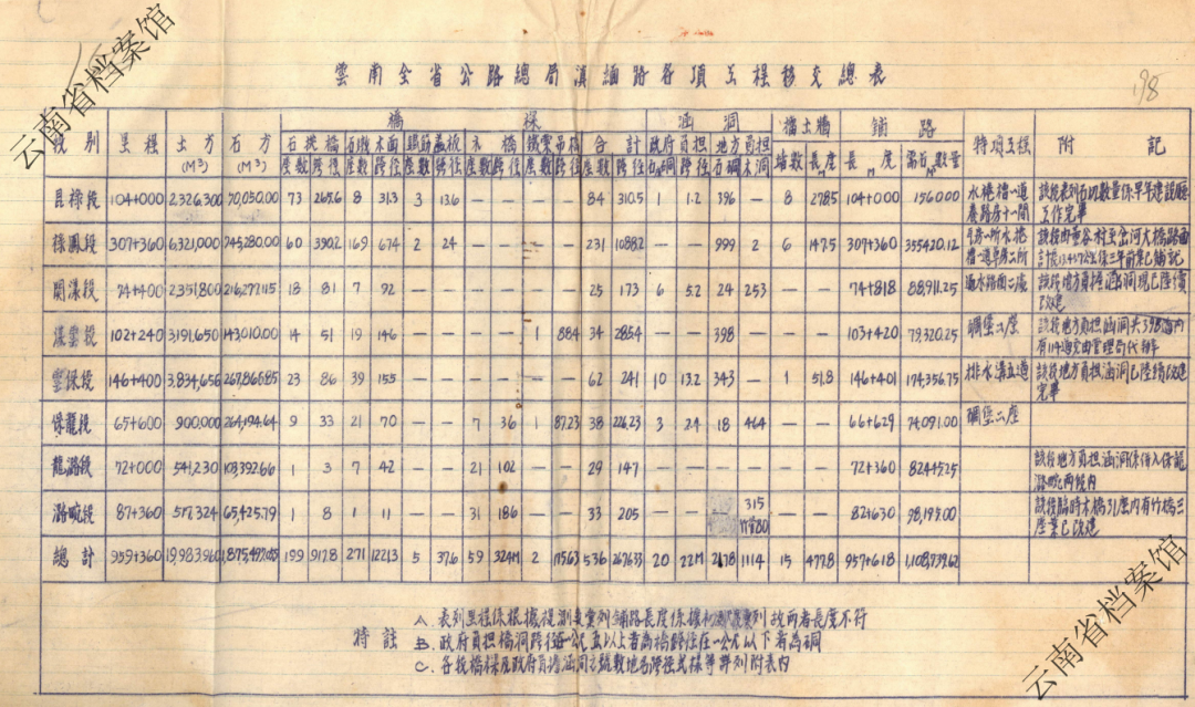 图为云南全省公路总局滇缅公路各项工程移交总表。1939年7月18日,云南全省公路总局致函滇缅公路运输管理局,附上了各项工程移交清册。