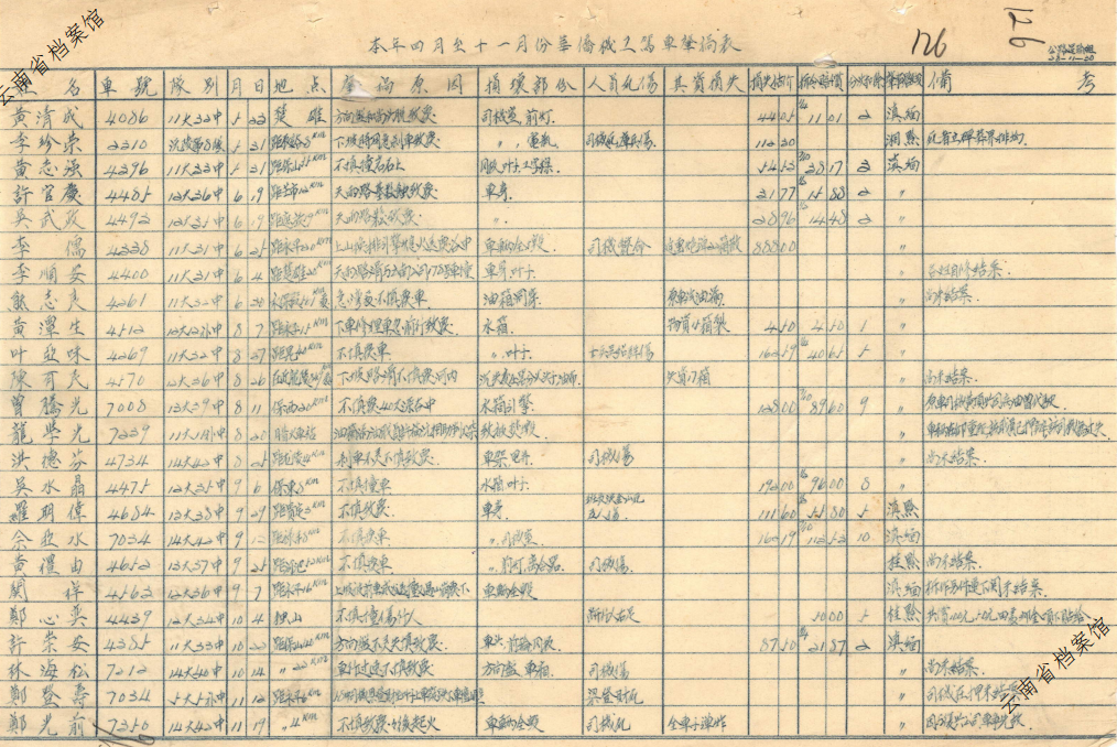 图为西南运输处1939年4—11月份南侨机工驾车肇祸表(1939年11月30日),从图表中不难看出,短短 4 个月的时间里, 南侨机工在运输途中遭遇车祸多起,机工伤亡多名。