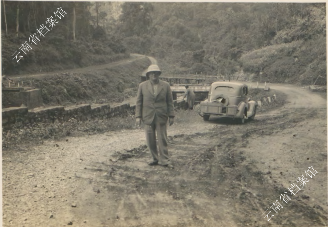 图为美国驻华大使纳尔逊•詹森视察滇缅公路途中