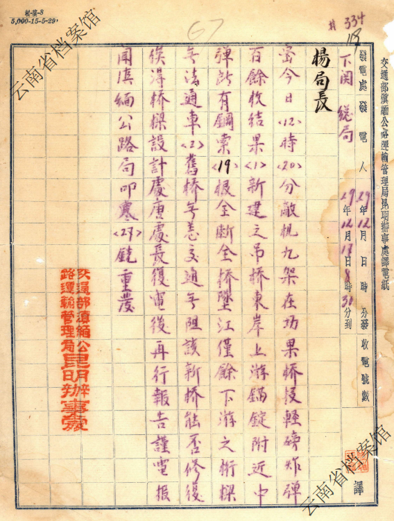 图为1940年12月17日,滇缅公路运输管理局昆明办事处关于敌机轰炸功果桥受损情况的电。