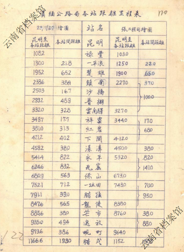 图为滇缅公路局各站距离里程表(1939年3月30日)